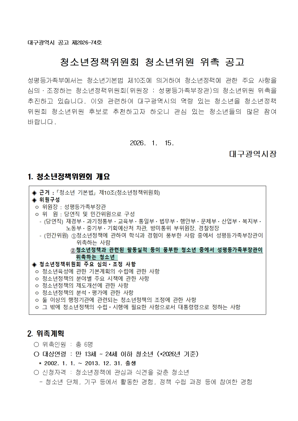 성평등가족부에서는 청소년기본법 제10조에 의거하여 청소년정책에 관한 주요 사항을 심의?조정하는 청소년정책위원회(위원장 : 성평등가족부장관)의 청소년위원 위촉을 추진하고 있습니다. 이와 관련하여 대구광역시의 역량 있는 청소년을 청소년정책위원회 청소년위원 후보로 추천하고자 하오니 관심 있는 청소년들의 많은 참여 바랍니다.