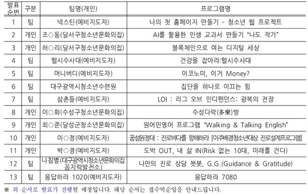 | [발표] 대구광역시 청소년활동 프로그램 경진대회 현장 발표 프로그램 선정 |