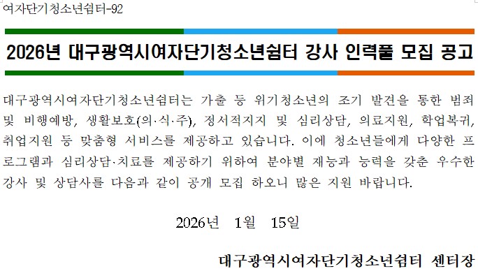 2026년 대구광역시여자단기청소년쉼터 강사 인력풀 모집 공고