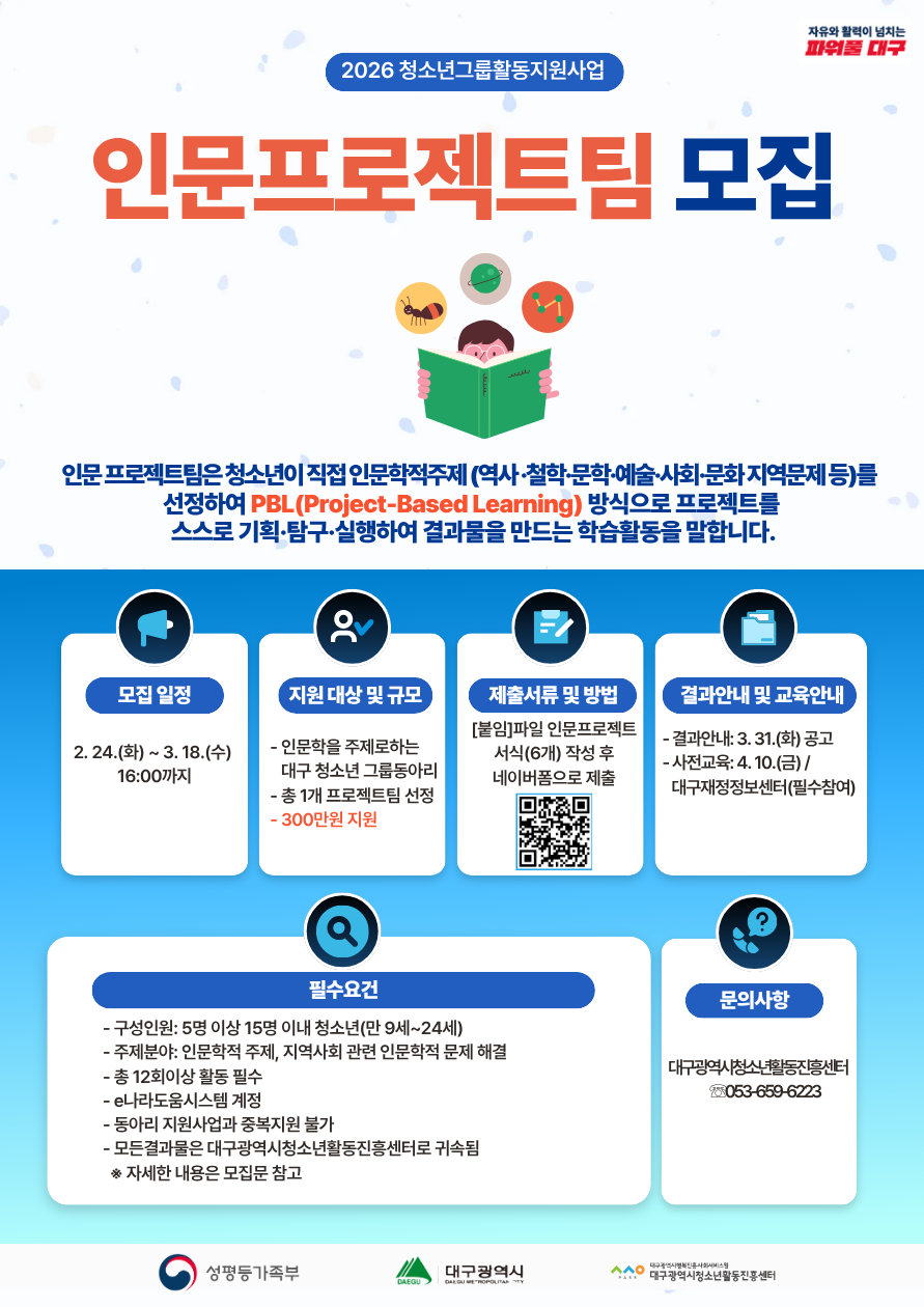 대구광역시청소년활동진흥센터에서는 청소년이 직접 인문학주제(역사, 철학, 문학, 사회, 문화, 지역문제 등)를 선정하여 PBL(Project-Based Learning)방식으로 프로젝트를 스스로 기획, 탐구, 실행하여 결과물을 만드는 「2026년 대구광역시 인문프로젝트팀」을 아래와 같이 모집합니다. 이에 지역 청소년 프로젝트팀(동아리)의 많은 관심과 신청바랍니다.