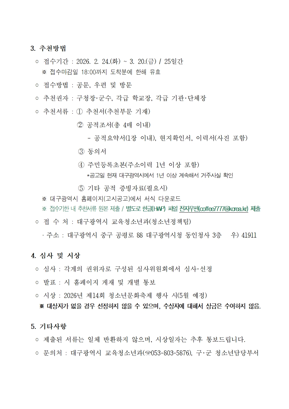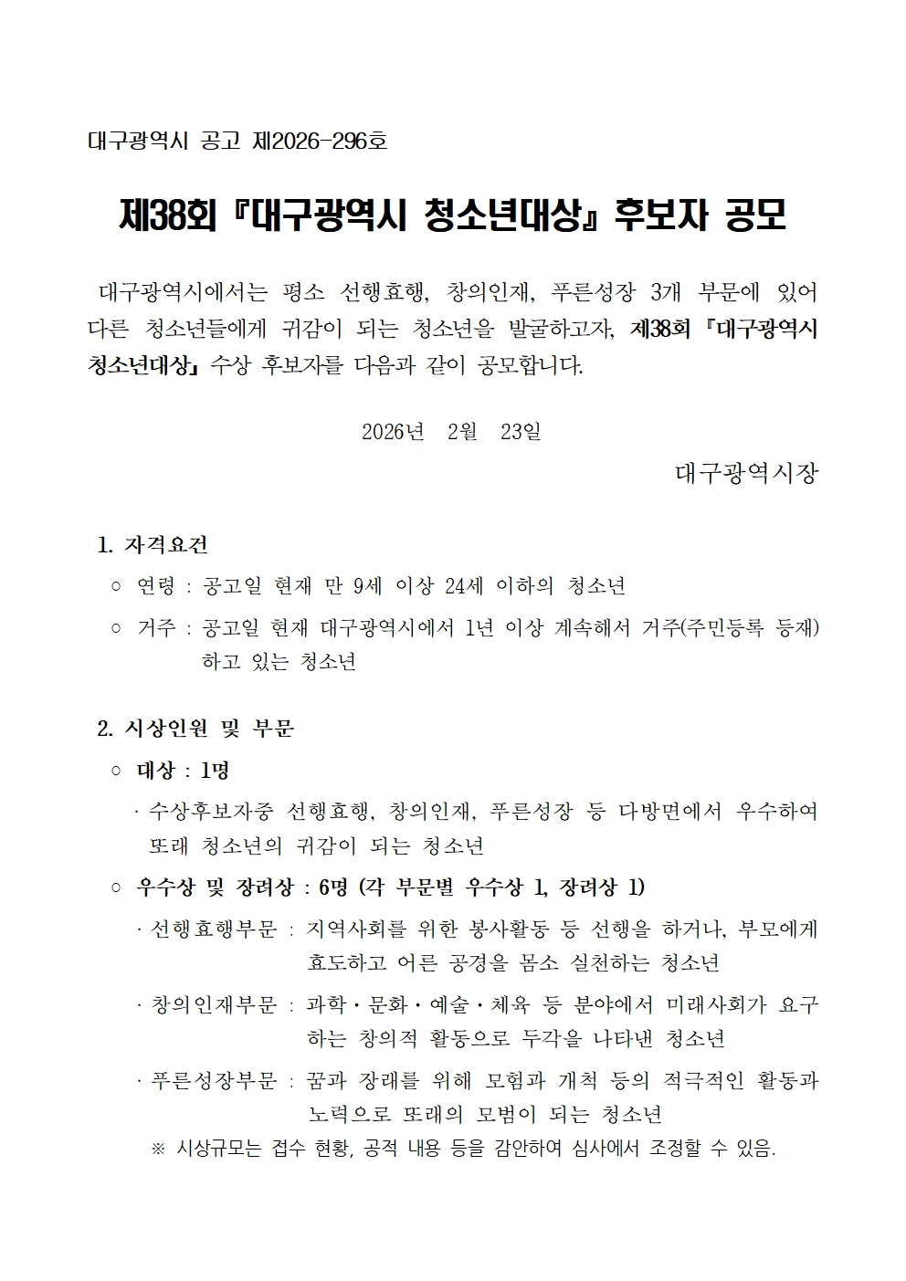제 38회 대구광역시 청소년대상 후보자 공모