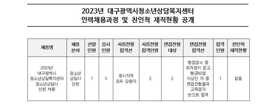 | 2023년 대구광역시청소년상담복지센터 청소년상담사 인턴 인력 채용과정 및 친인척 재직현황 공개 |