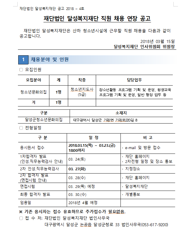 [알림] 재단법인 달성복지재단 직원 채용 연장 공고
