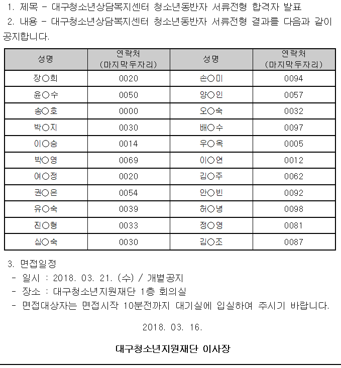 [발표]대구청소년상담복지센터 청소년동반자(전일제,시간제) 채용 서류전형 결과발표