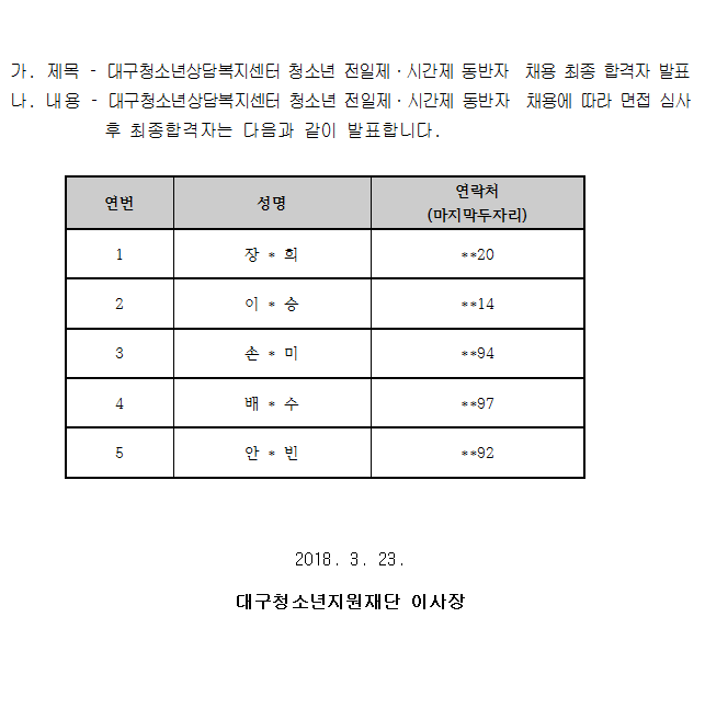 대구청소년상담복지센터 청소년 전일제·시간제 동반자 채용 최종 합격자 발표
