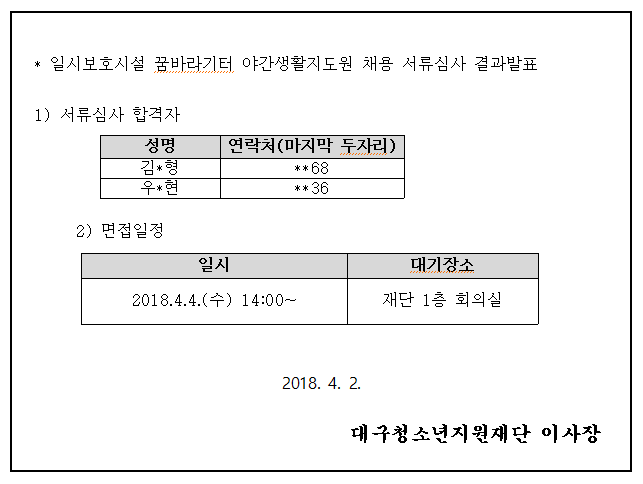[발표]일시보호시설 꿈바라기터 야간생활지도원 채용 서류심사 결과