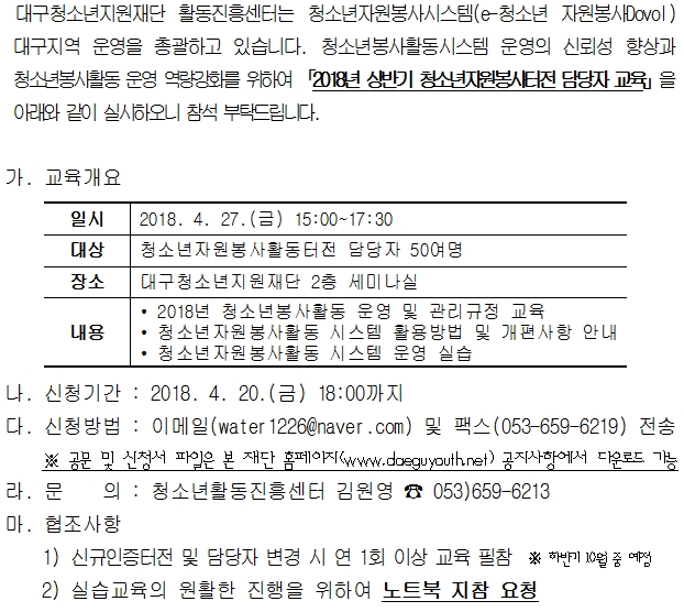 [공문]2018년 상반기 청소년봉사활동 터전담당자 교육 참석협조.hwp (80 KB)