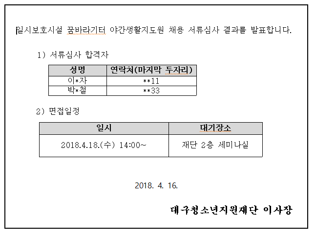 [발표]일시보호시설 꿈바라기터 야간생활지도원 채용 서류심사 결과