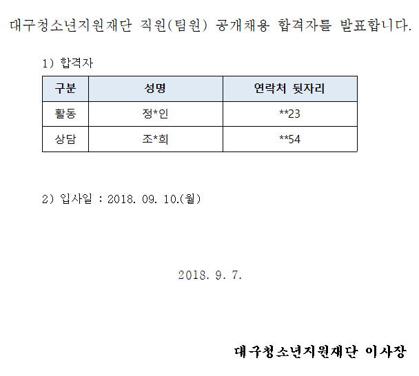 [발표] 대구청소년지원재단 직원(팀원) 공개채용 합격자 발표