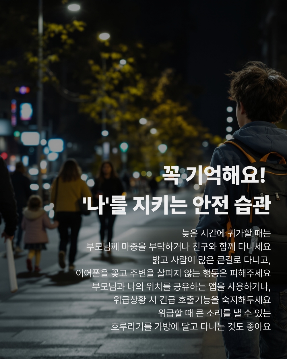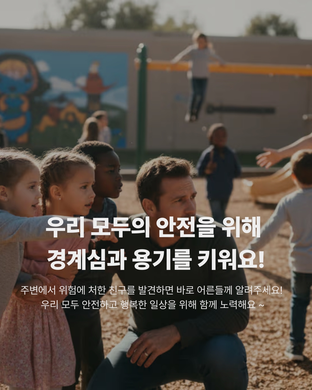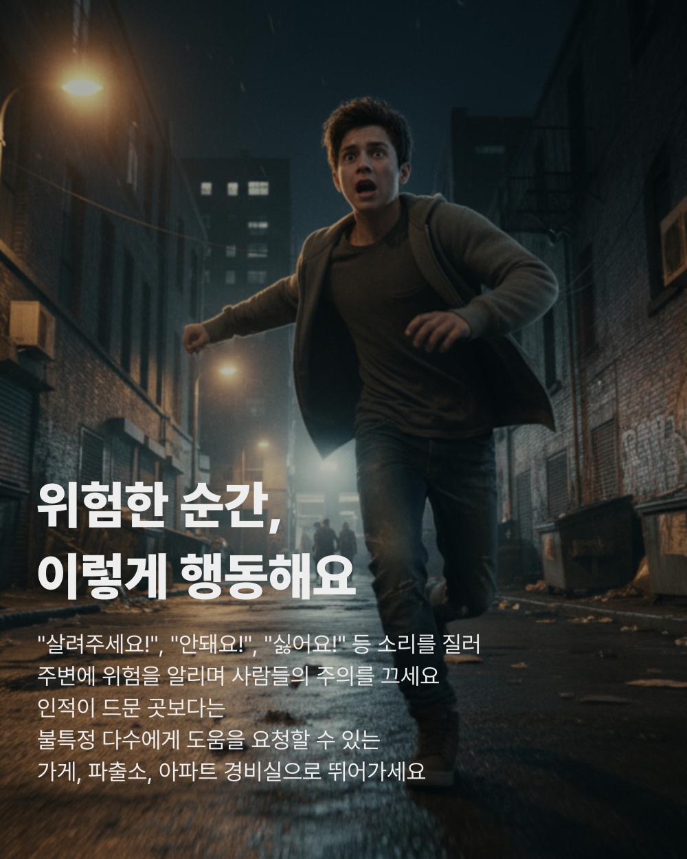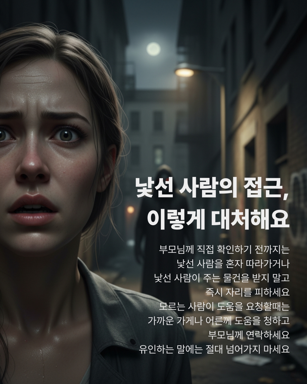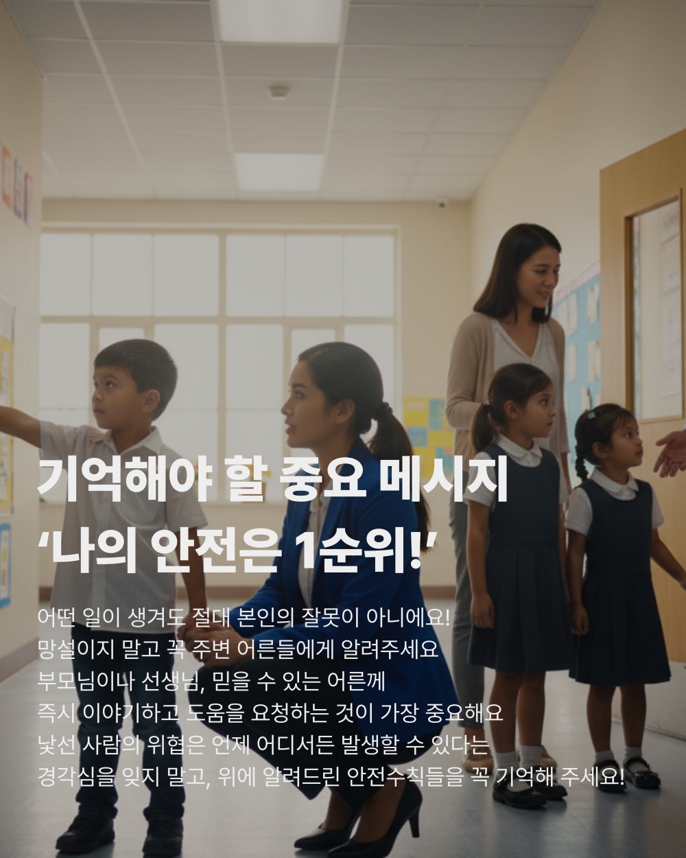 👣 낯선 사람이 다가올 땐 → 혼자 따라가지 말고, 즉시 자리를 벗어나세요. → 위험하면 큰 소리로 “안 돼요!” 외치고 주변에 도움을 요청하세요.