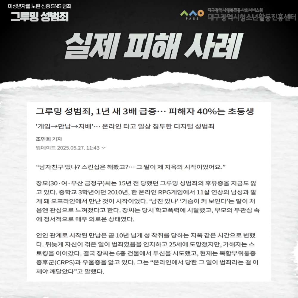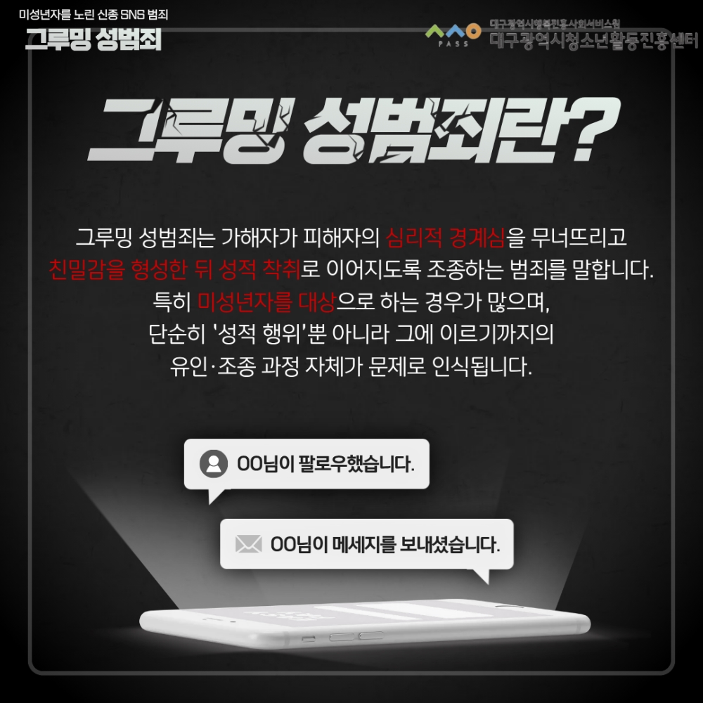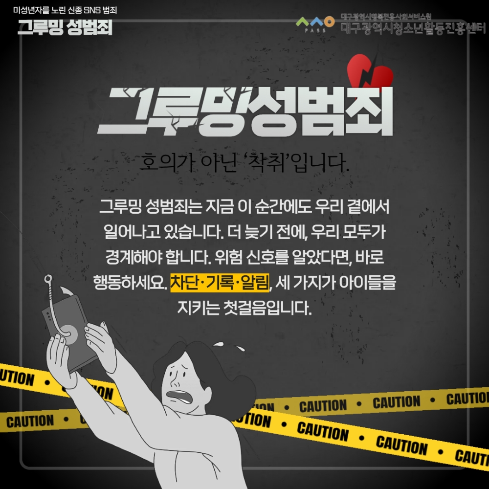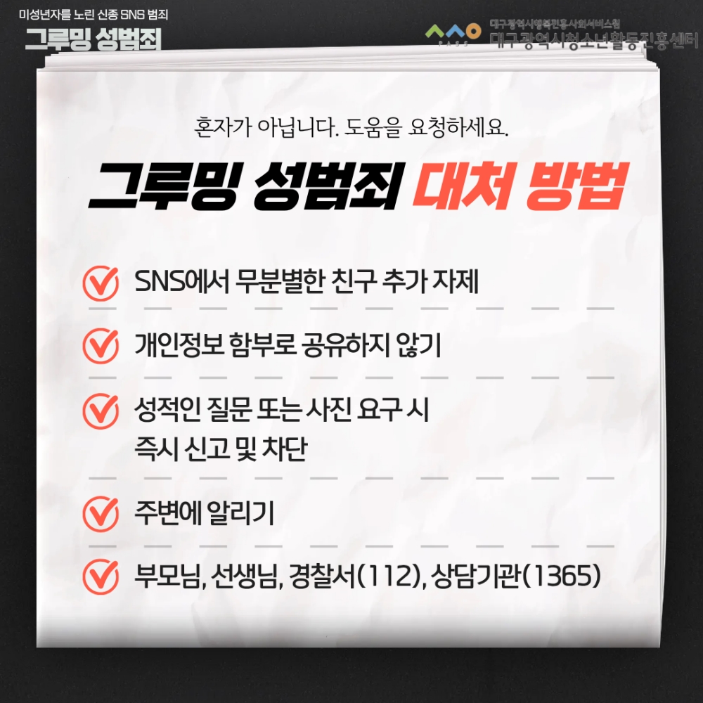 💔 그루밍 성범죄는 → SNS에서 친밀감을 쌓아 조종 후 착취하는 범죄입니다. → 의심스러운 대화는 차단·기록·알림이 원칙!