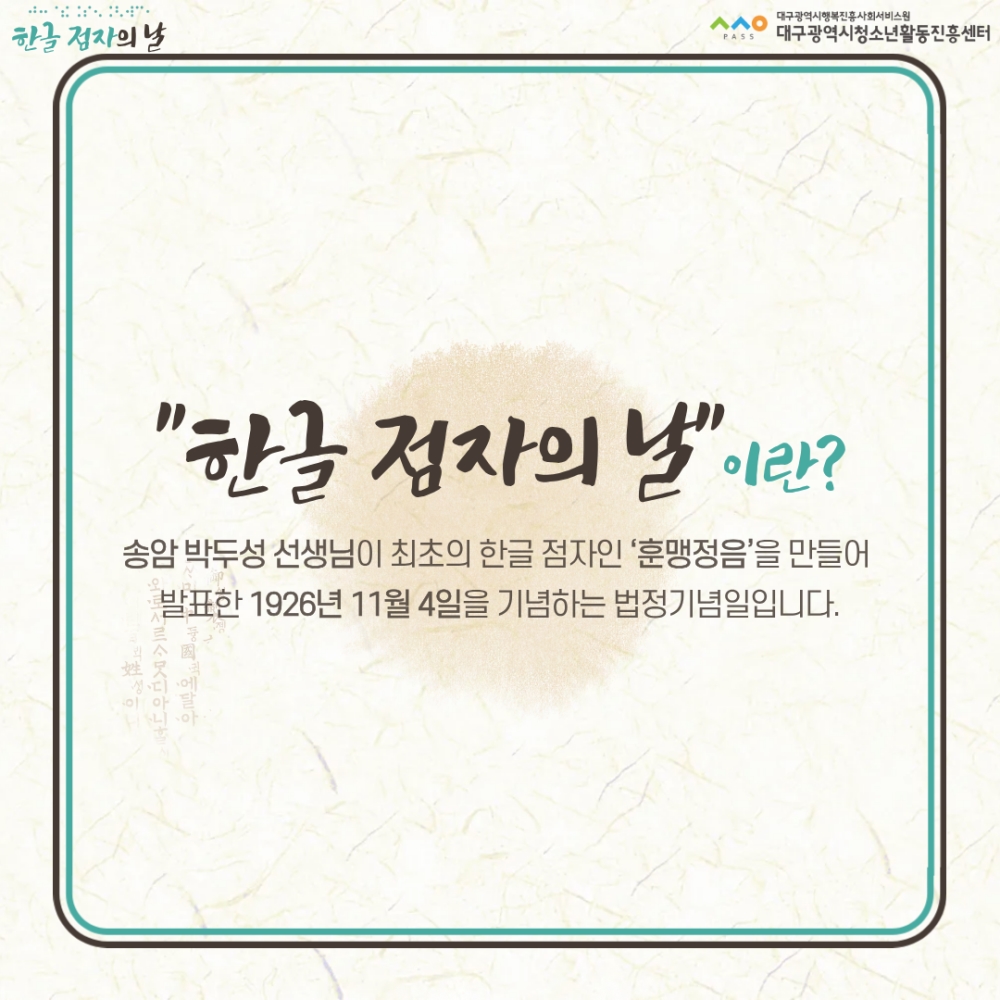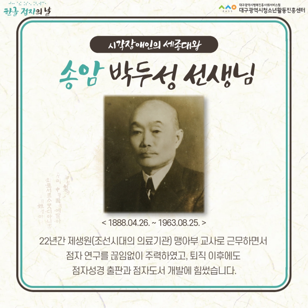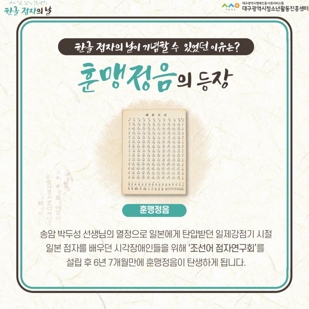 송암 박두성 선생님이 만든 최초의 한글 점자 ‘훈맹정음’ 발표를 기념하는 날입니다.