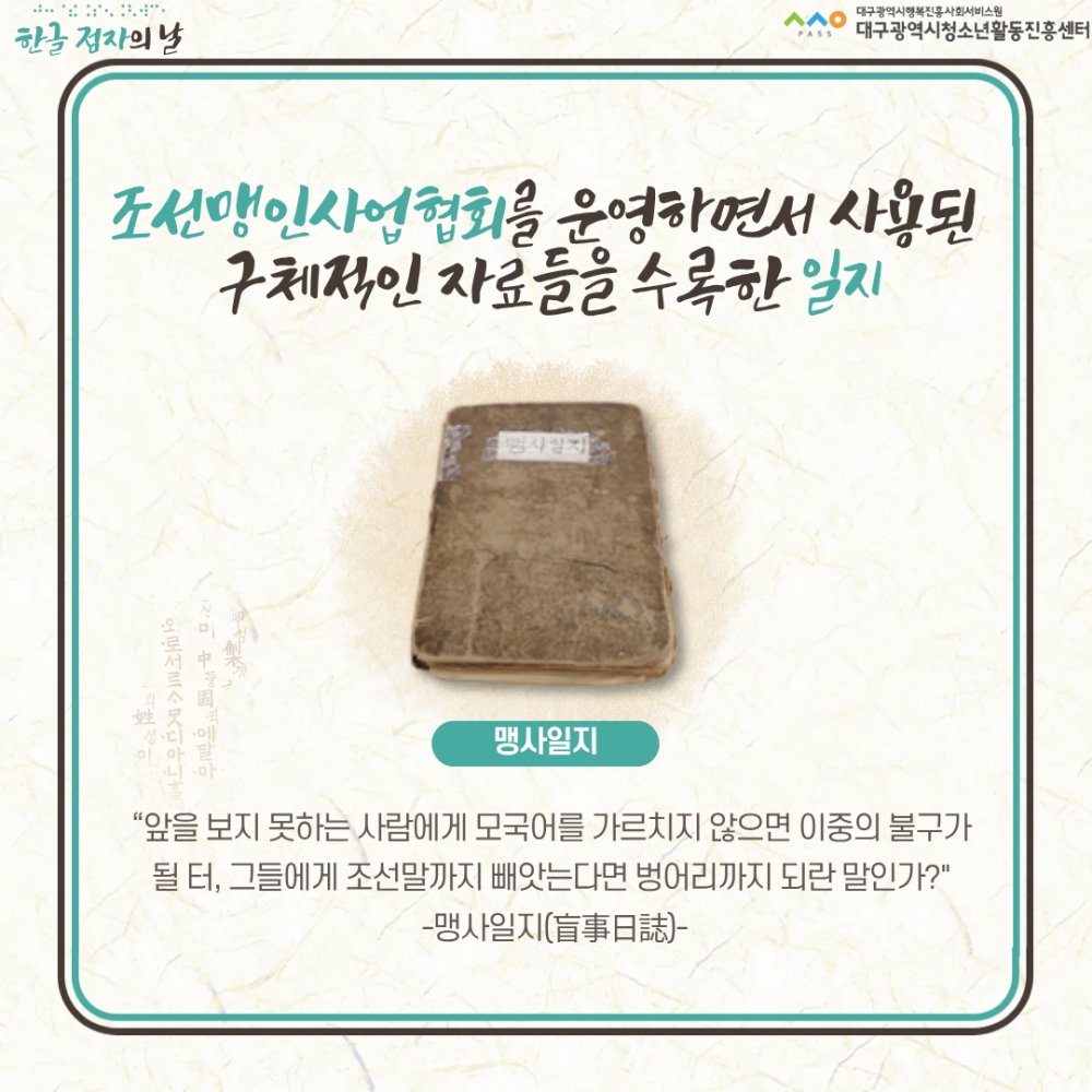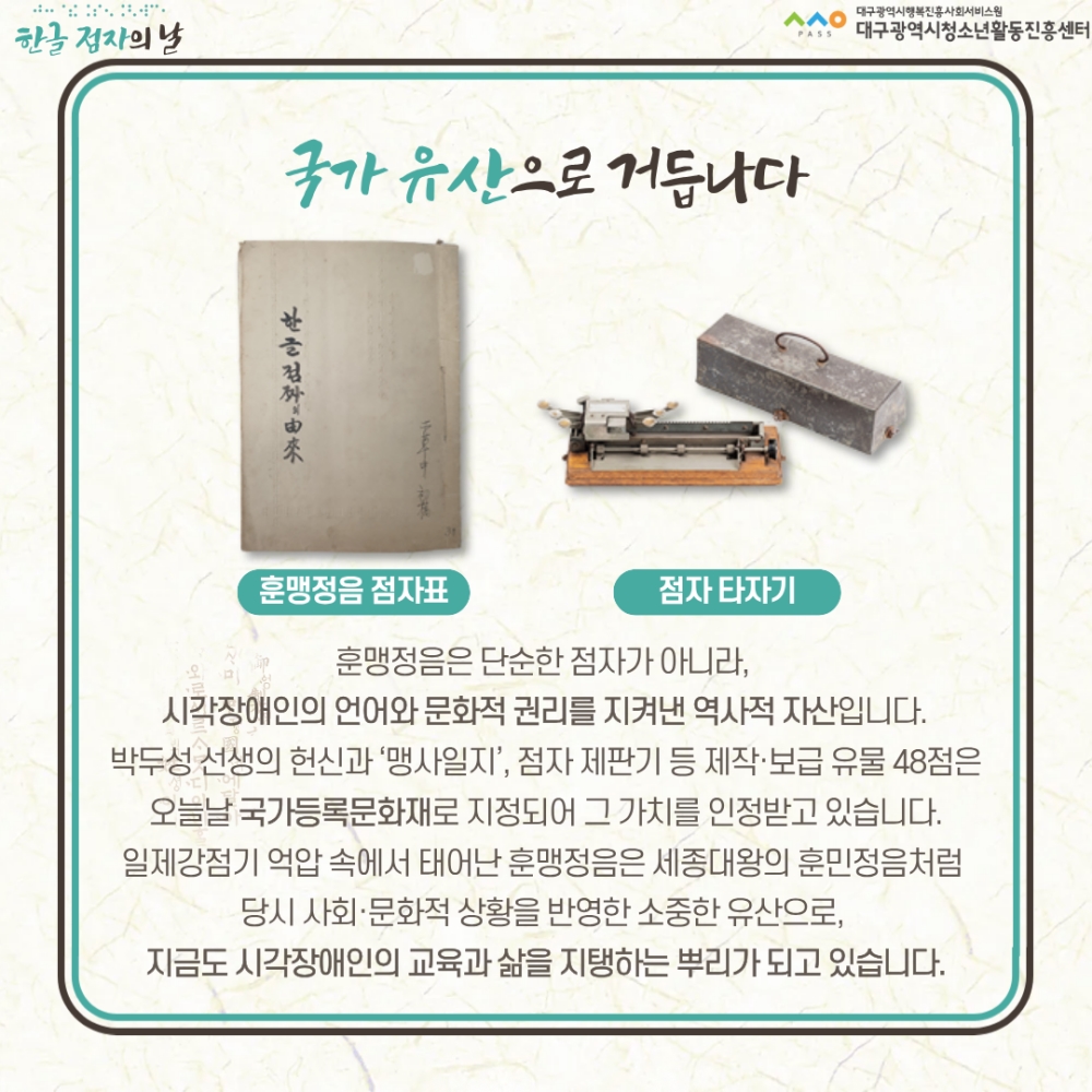 시각장애인의 언어·문화적 권리를 지켜낸 역사적 유산입니다.