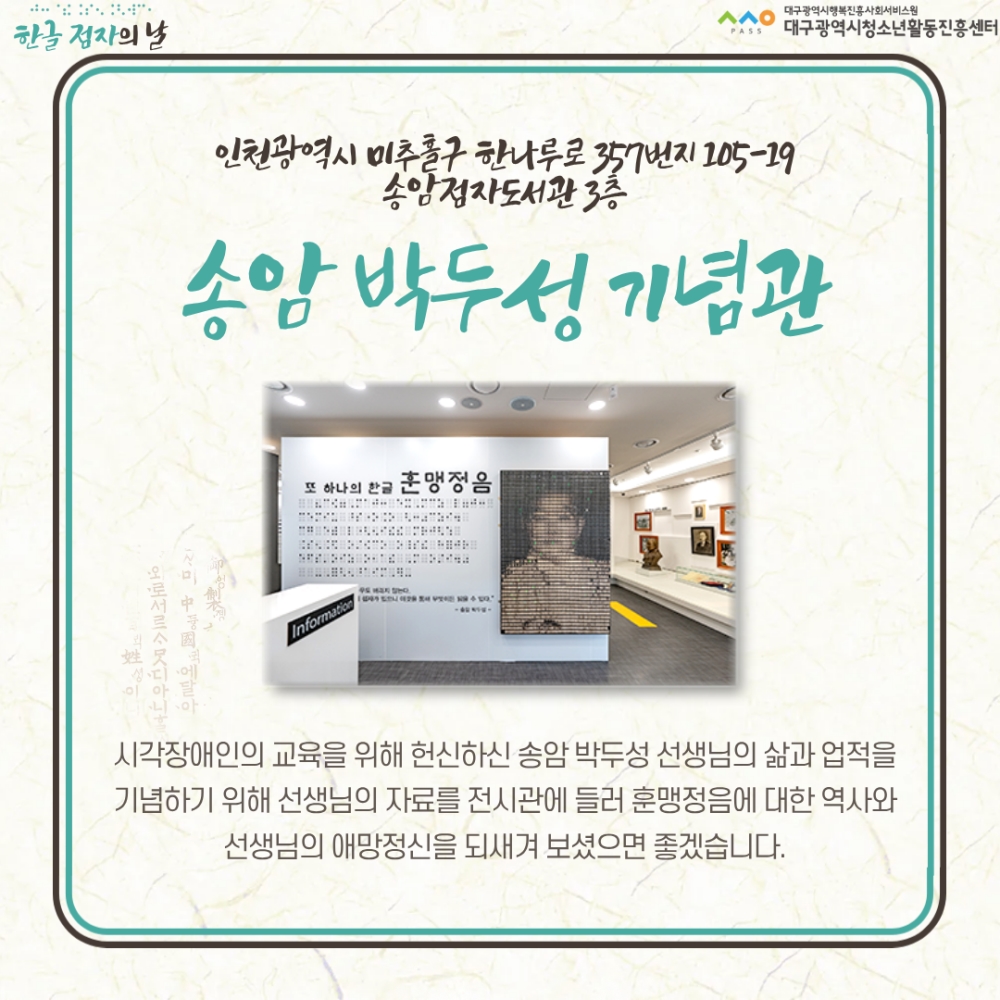 그 정신은 인천 ‘송암 박두성 기념관’에 고스란히 남아 있습니다.
