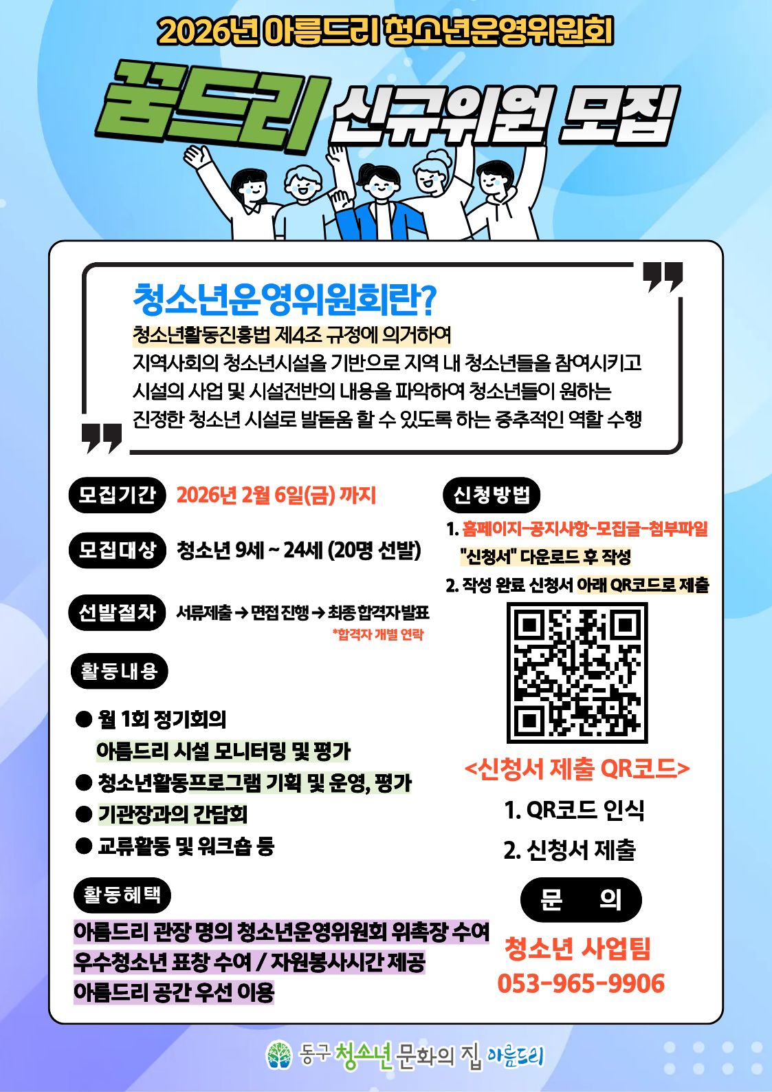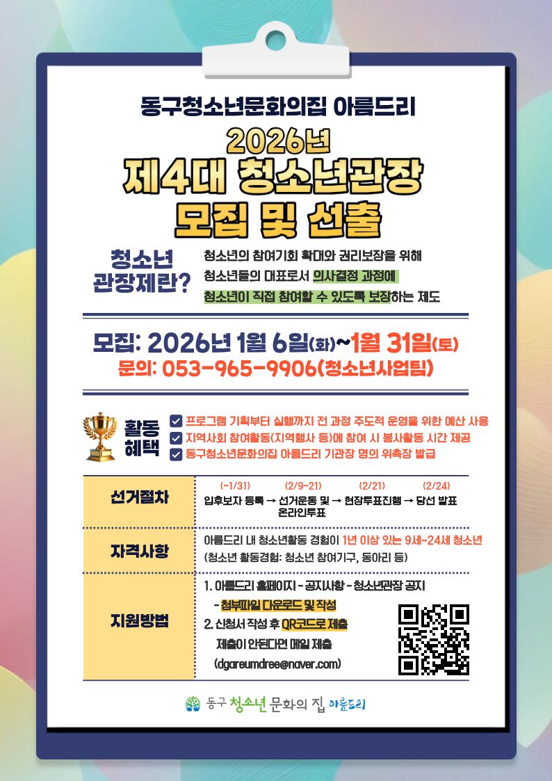 2026년도 대구광역시 동구청소년문화의집 아름드리 청소년운영위원회 '꿈드리 7기' 위원 모집(활동기간: 2월~12월)